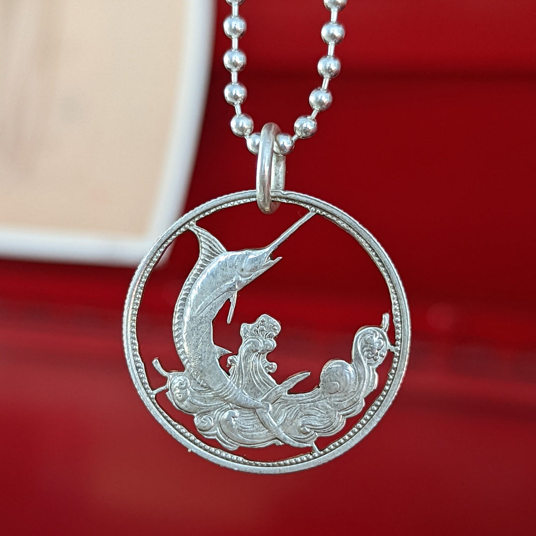 This necklace begins with a genuine 1960s Bahamian Half Dollar, carefully hand-sawed to free the image of a swordfish leaping from the waves. Each cut is made stroke by stroke with a jeweler’s saw, preserving the intricate lines of the fish and the motion of the sea beneath it. The finished cut coin is polished, mounted with a sterling silver bale and jump ring, and suspended from a sterling ball chain.