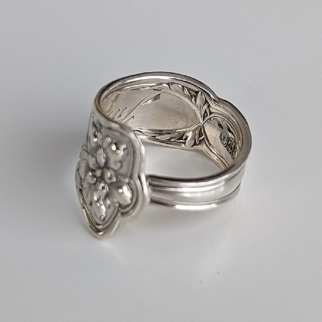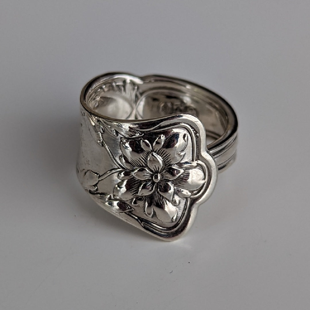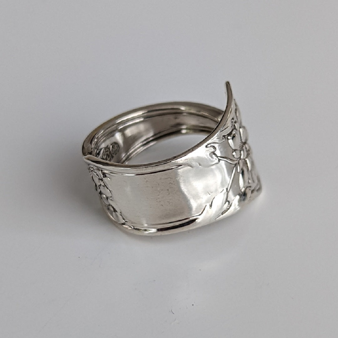 Crafted from vintage solid sterling silver tableware, this unique ring's relief showcases delicate flowers with a sparkling polished finish.