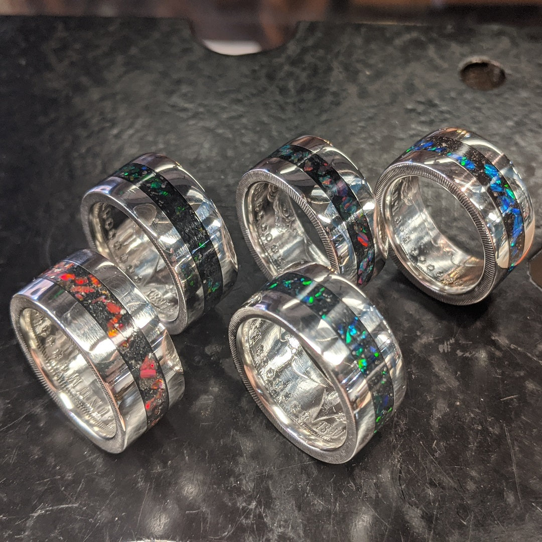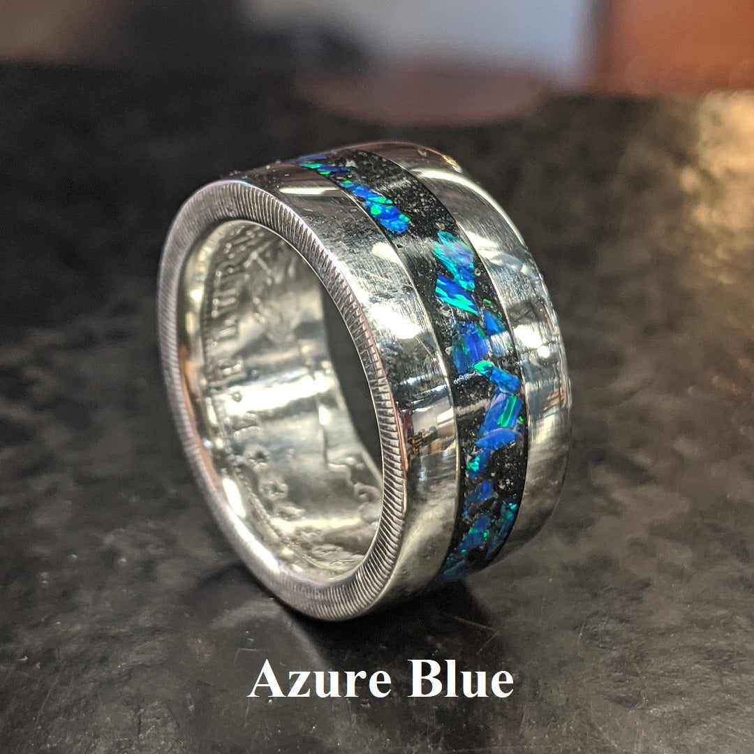Our Morgan Silver Dollar Coin Ring with Inlay takes one of America’s most iconic coins and elevates it into a custom heirloom. Forged from a genuine Morgan Silver Dollar (.900 fine silver, minted 1878–1904 and again in 1921), the ring is set with a luminous opal inlay that shimmers with light and depth.