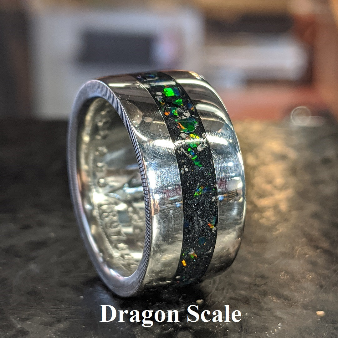 Our Morgan Silver Dollar Coin Ring with Inlay takes one of America’s most iconic coins and elevates it into a custom heirloom. Forged from a genuine Morgan Silver Dollar (.900 fine silver, minted 1878–1904 and again in 1921), the ring is set with a luminous opal inlay that shimmers with light and depth.