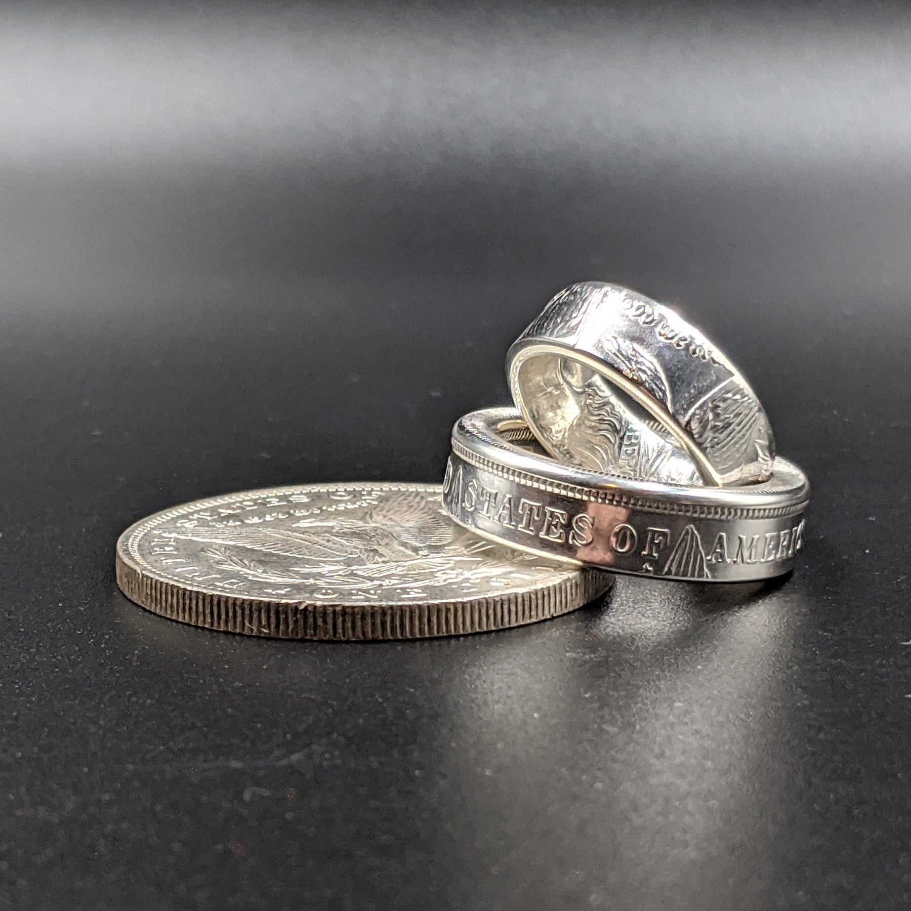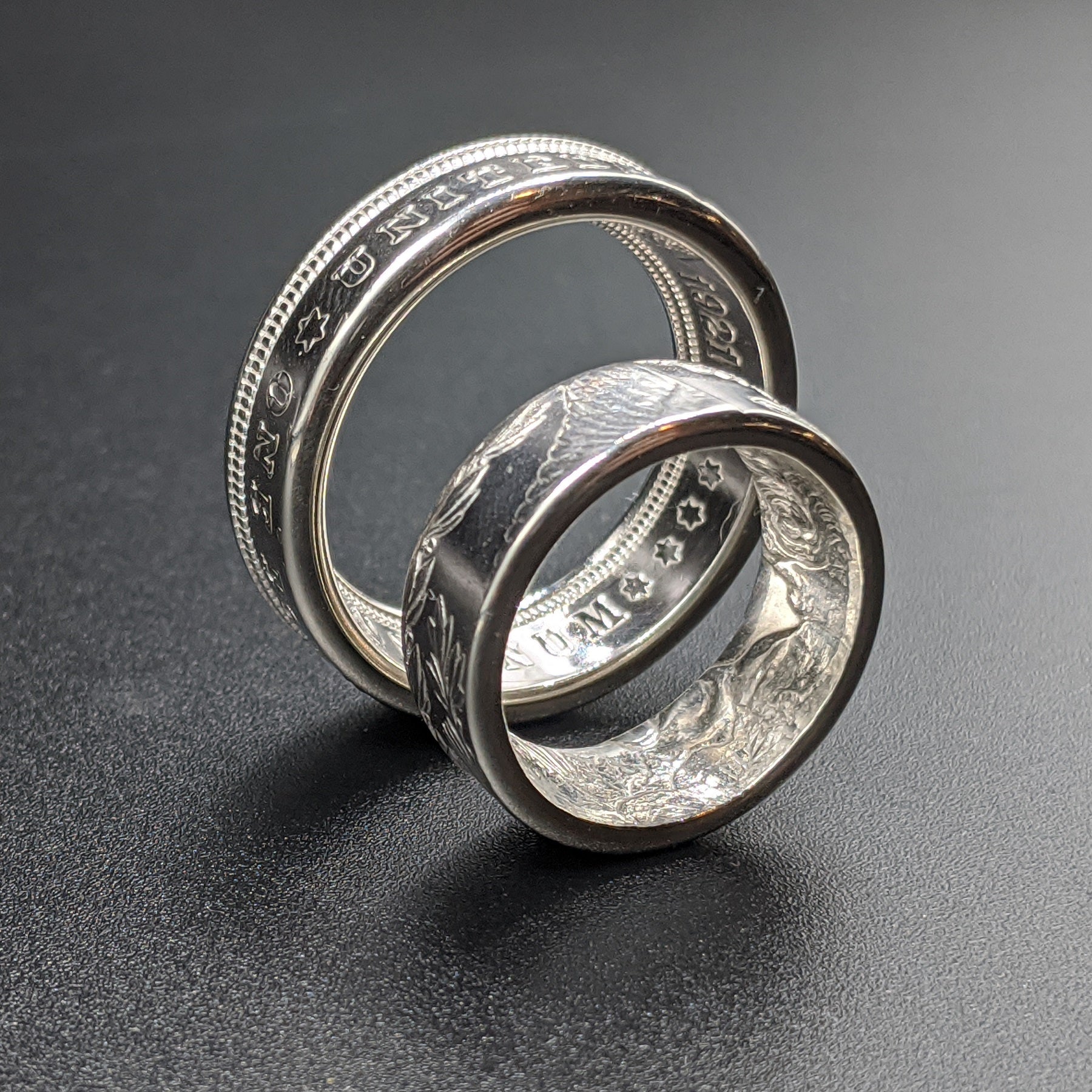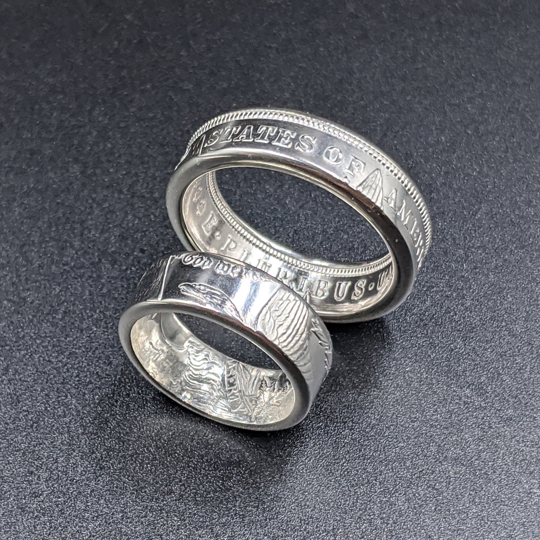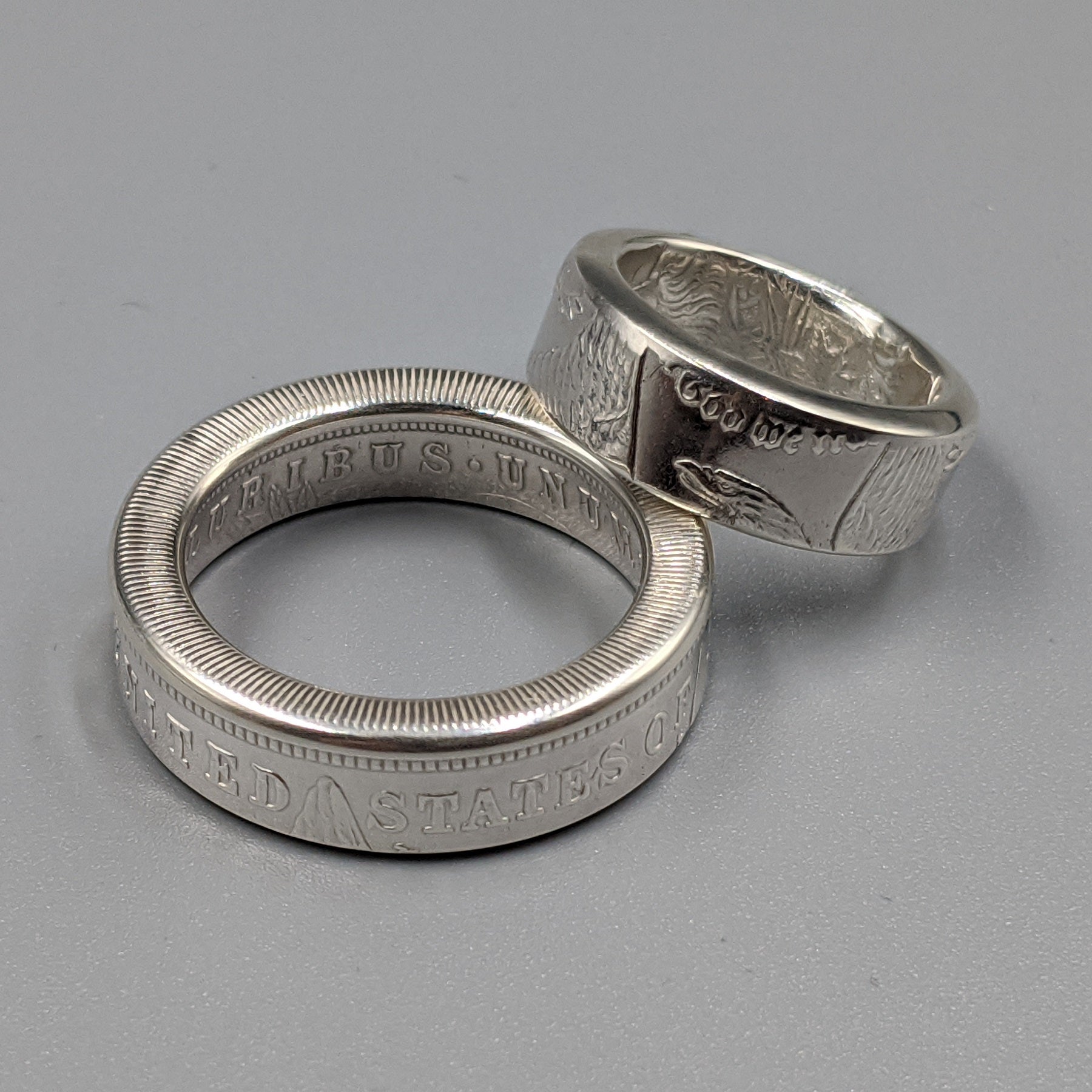 The outer band is traditionally sized for larger hands and preserves Lady Liberty’s profile and the coin’s original lettering. The inner band, crafted from the center of the same coin, is slimmer but equally rich in detail. Together, they create a matched pair connected by history and design.