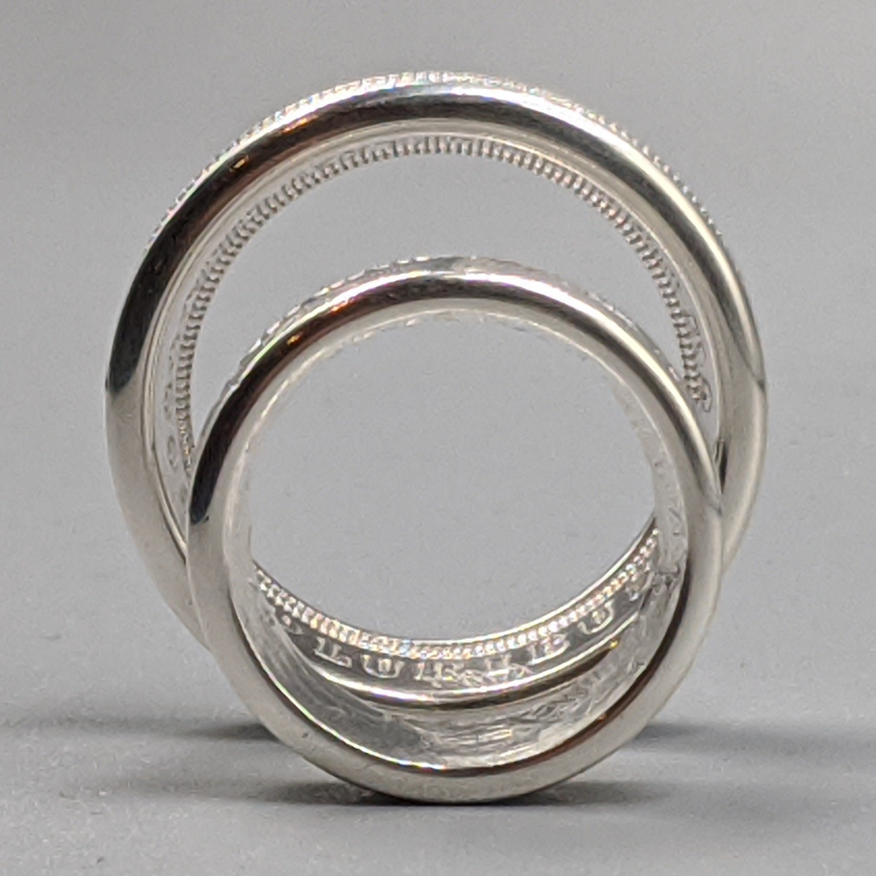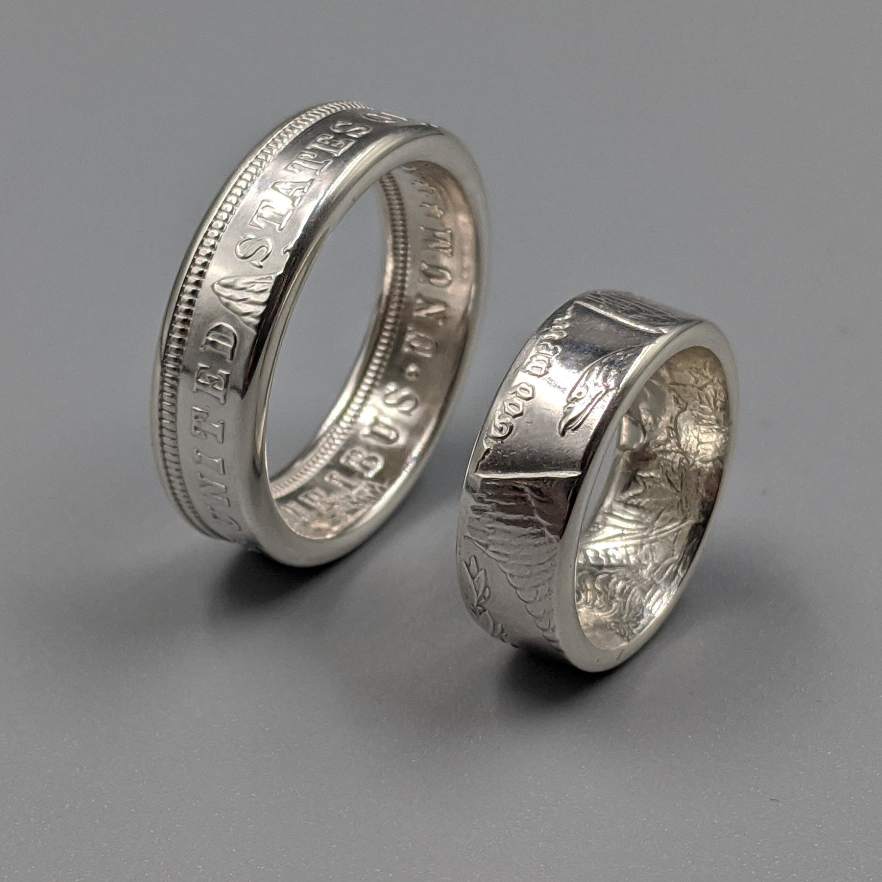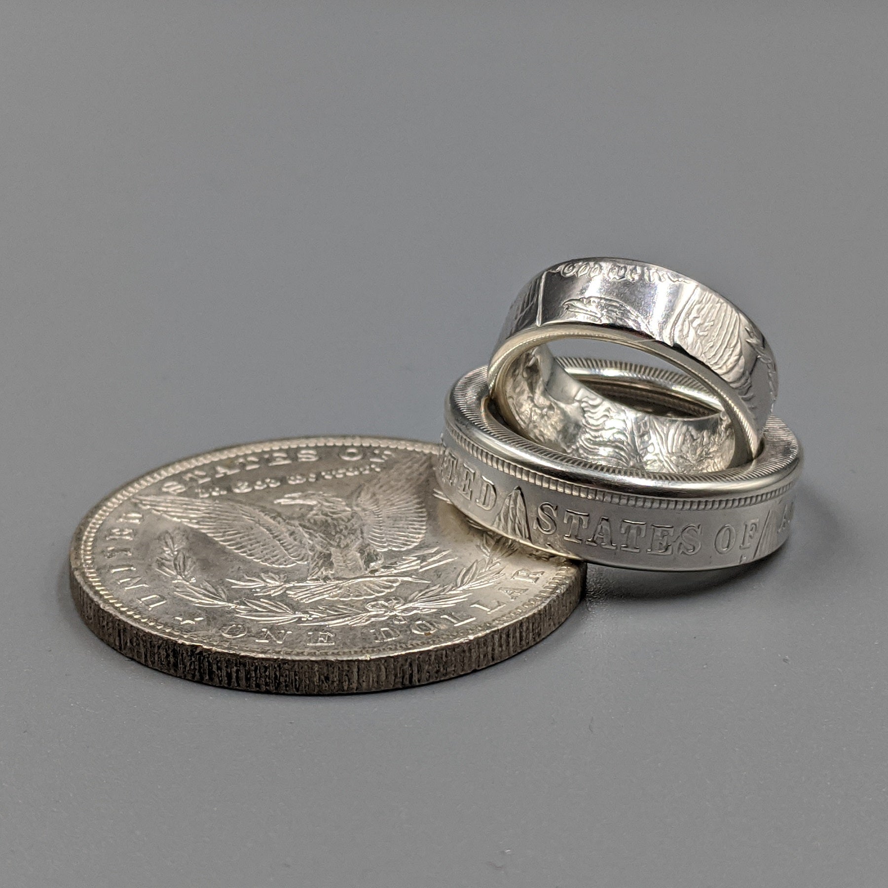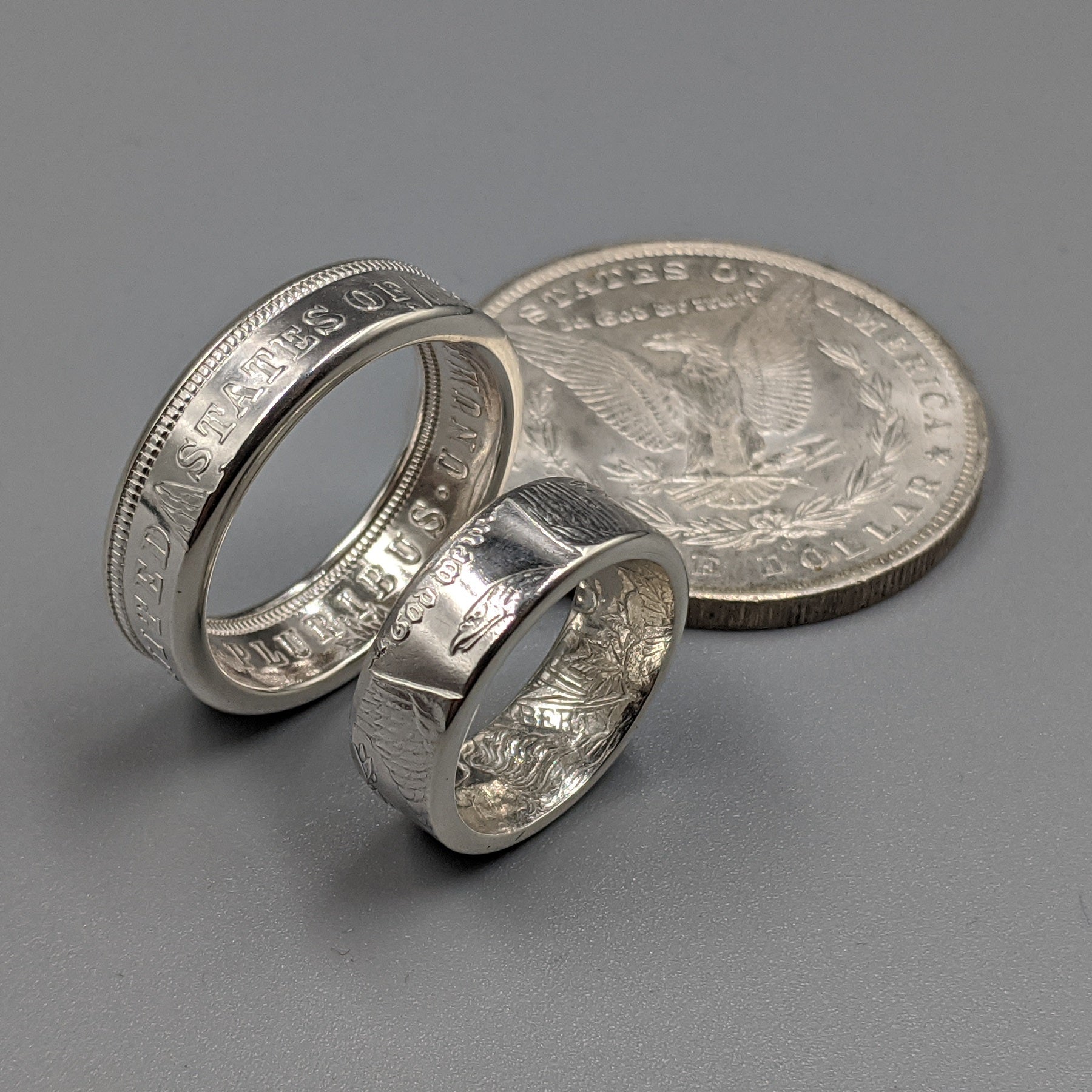 The outer band is traditionally sized for larger hands and preserves Lady Liberty’s profile and the coin’s original lettering. The inner band, crafted from the center of the same coin, is slimmer but equally rich in detail. Together, they create a matched pair connected by history and design.
