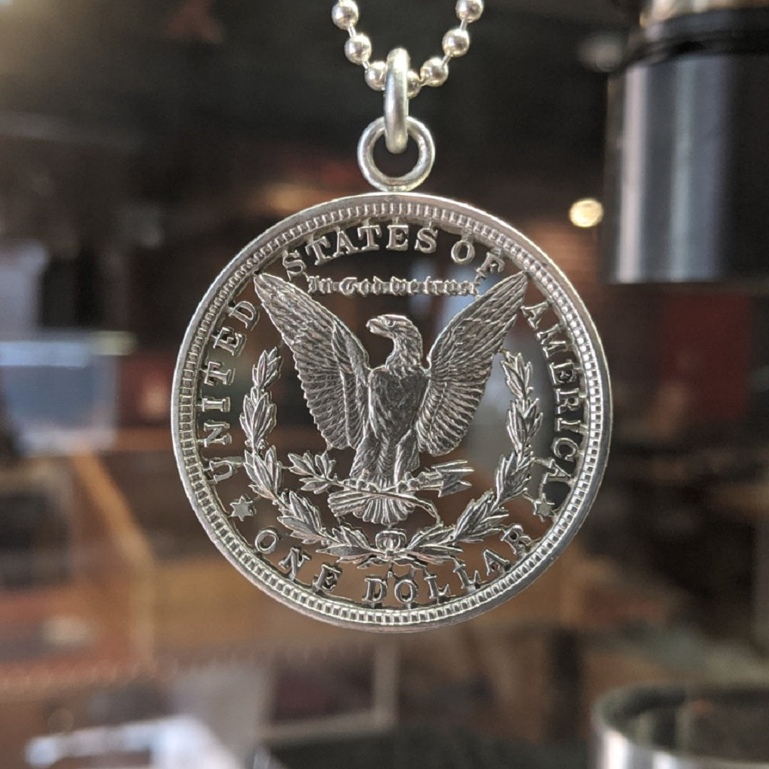 Each 1882 Morgan is hand-sawed to reveal the eagle, then polished, mounted with sterling fittings, and hung on a sterling ball chain. Every pendant is unique.