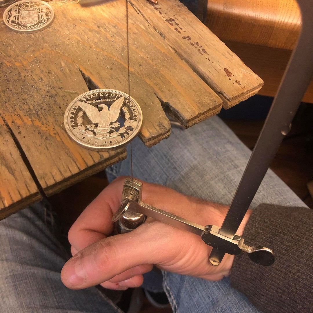 Each Morgan Silver Dollar is pierced and hand-sawed to reveal the eagle in full relief. The background is removed stroke by stroke, leaving the wings, feathers, and details of arrows and olive branch preserved in silver. Once cut, the coin is filed, polished, and mounted with a sterling silver bale and jump ring, then finished with a sterling ball chain.