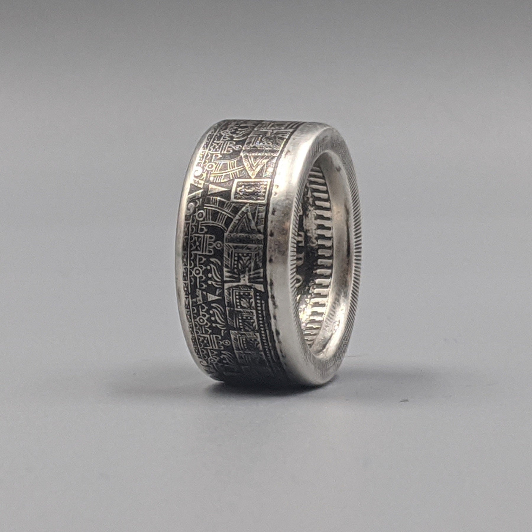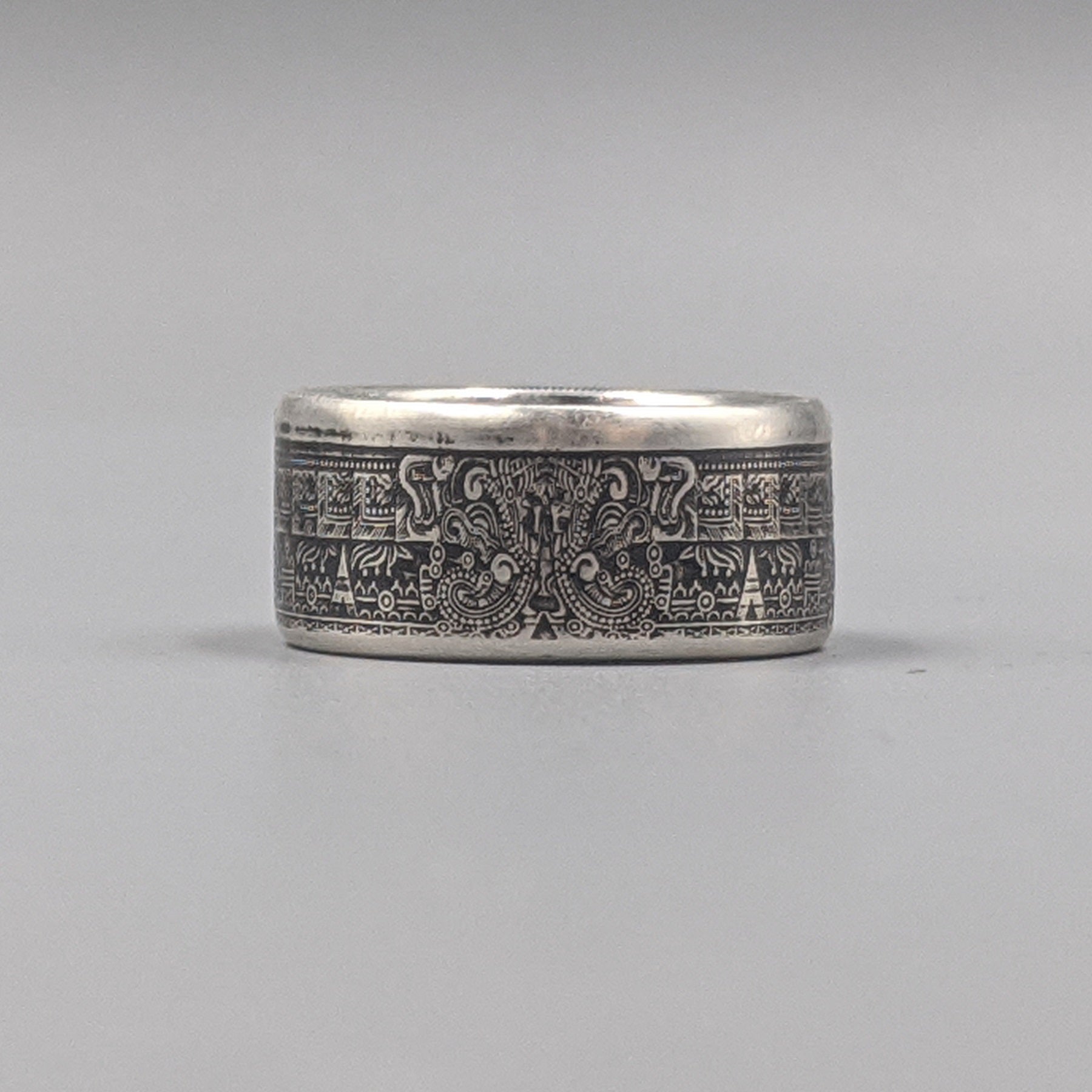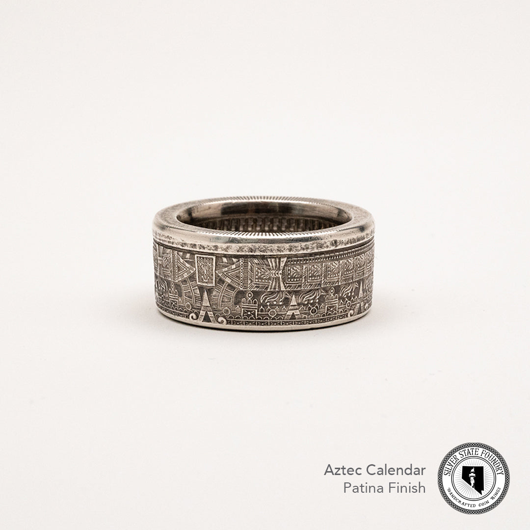 Each ring is hand‑forged to preserve the incredible detail of the original design. Deeply textured, substantial in weight, and steeped in history, the Aztec Calendar Coin Ring is a wearable artifact that connects you to an ancient world