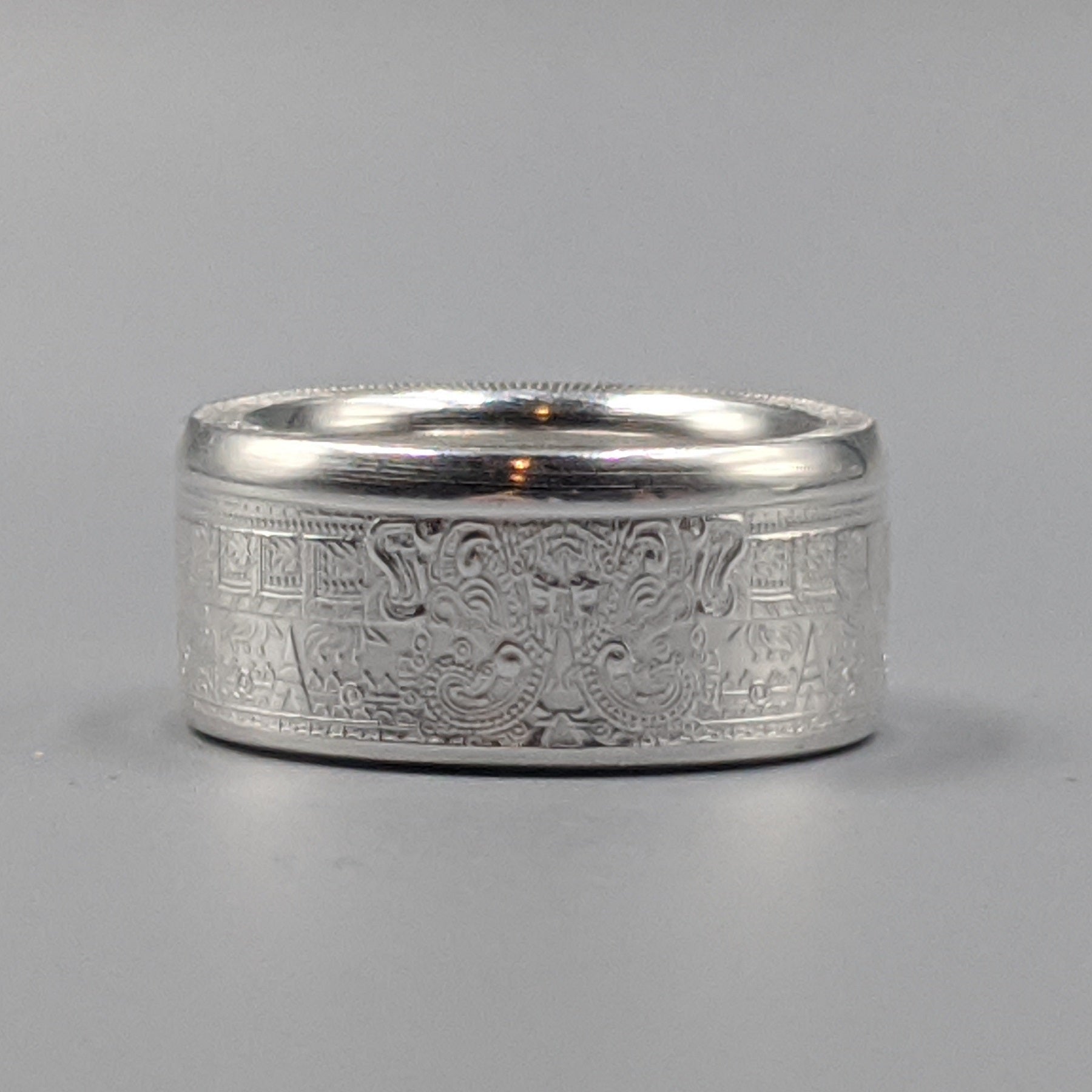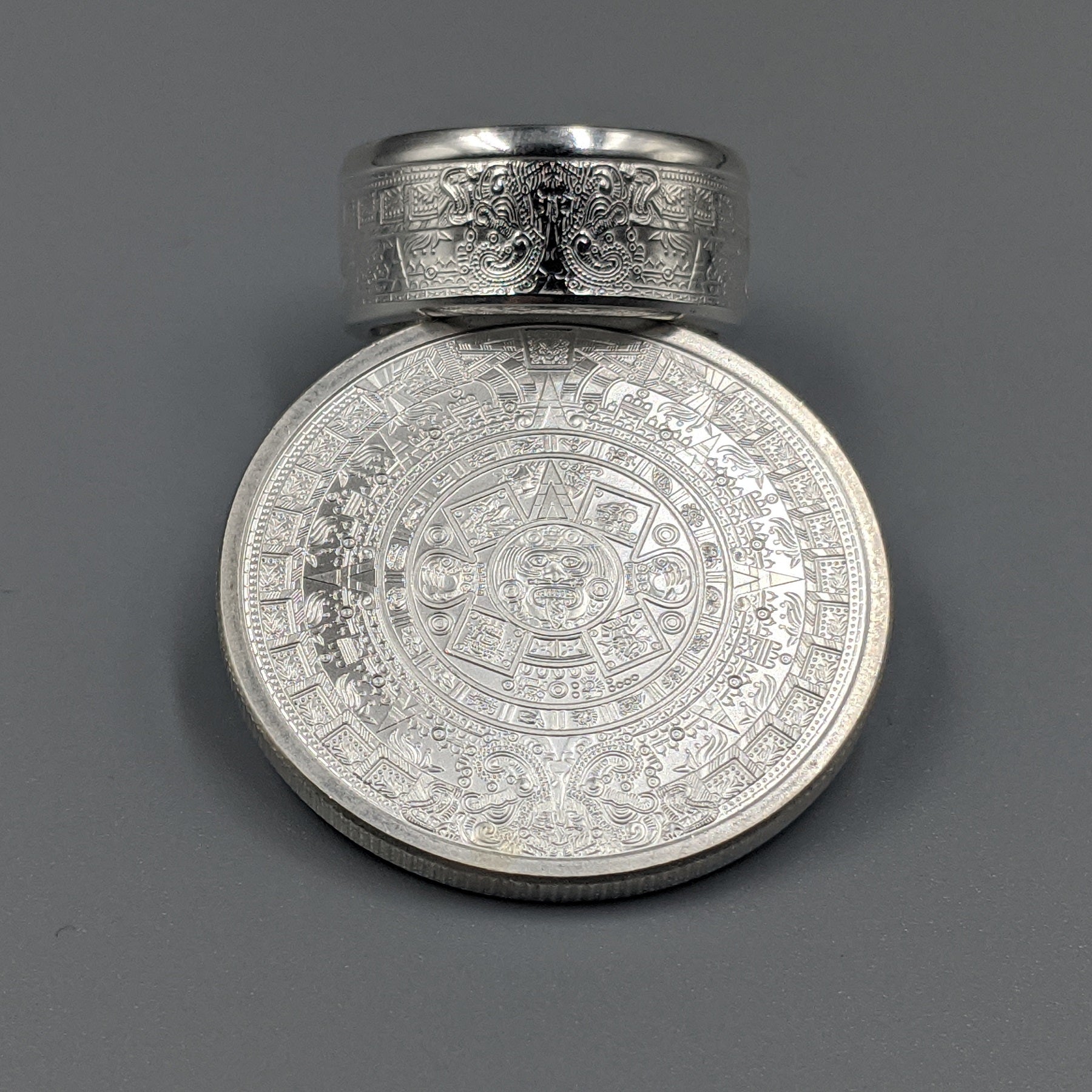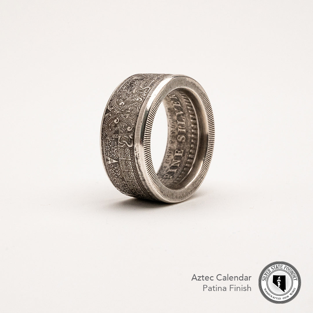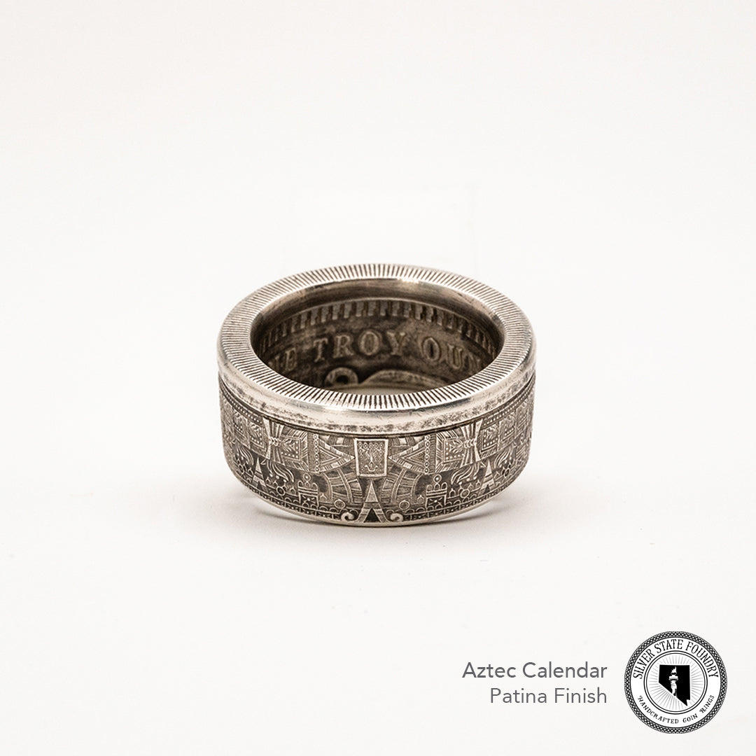 Forged from a genuine 1 oz .999 fine silver Aztec Calendar round, this ring carries the intricate symbols of one of the world’s greatest civilizations. The obverse showcases the legendary Piedra del Sol (Sun Stone) design—a sacred calendar that represents the cosmos and the cycles of life—while the reverse bears complementary imagery celebrating Aztec artistry.