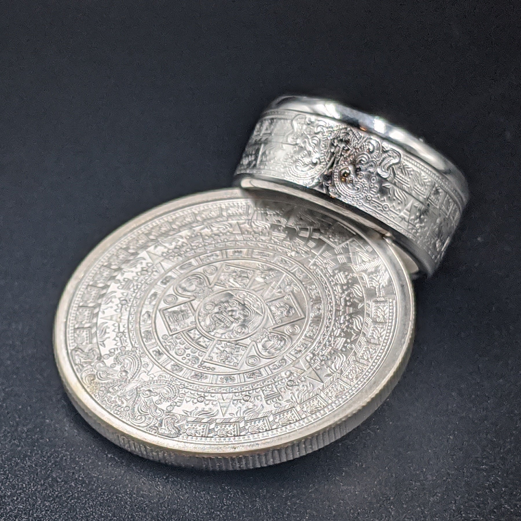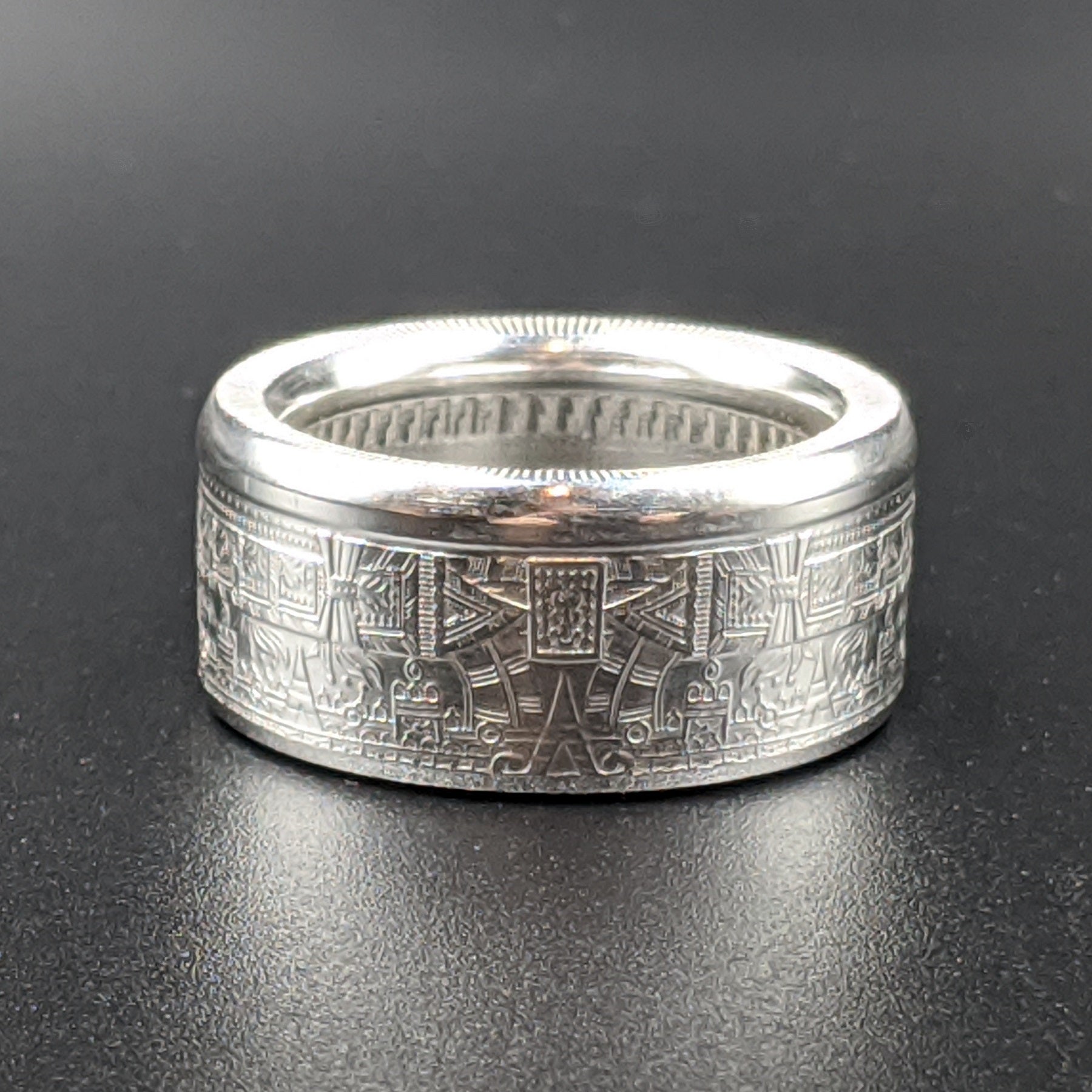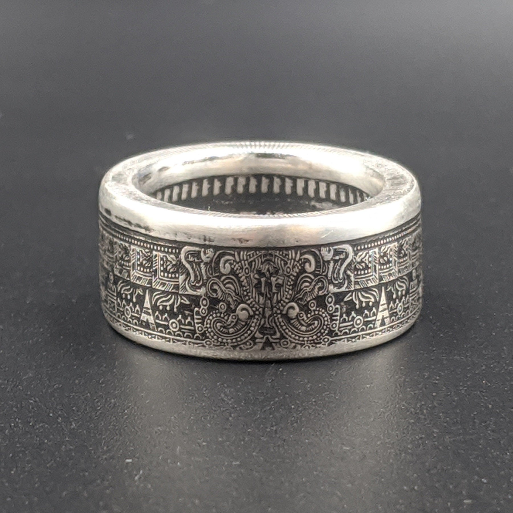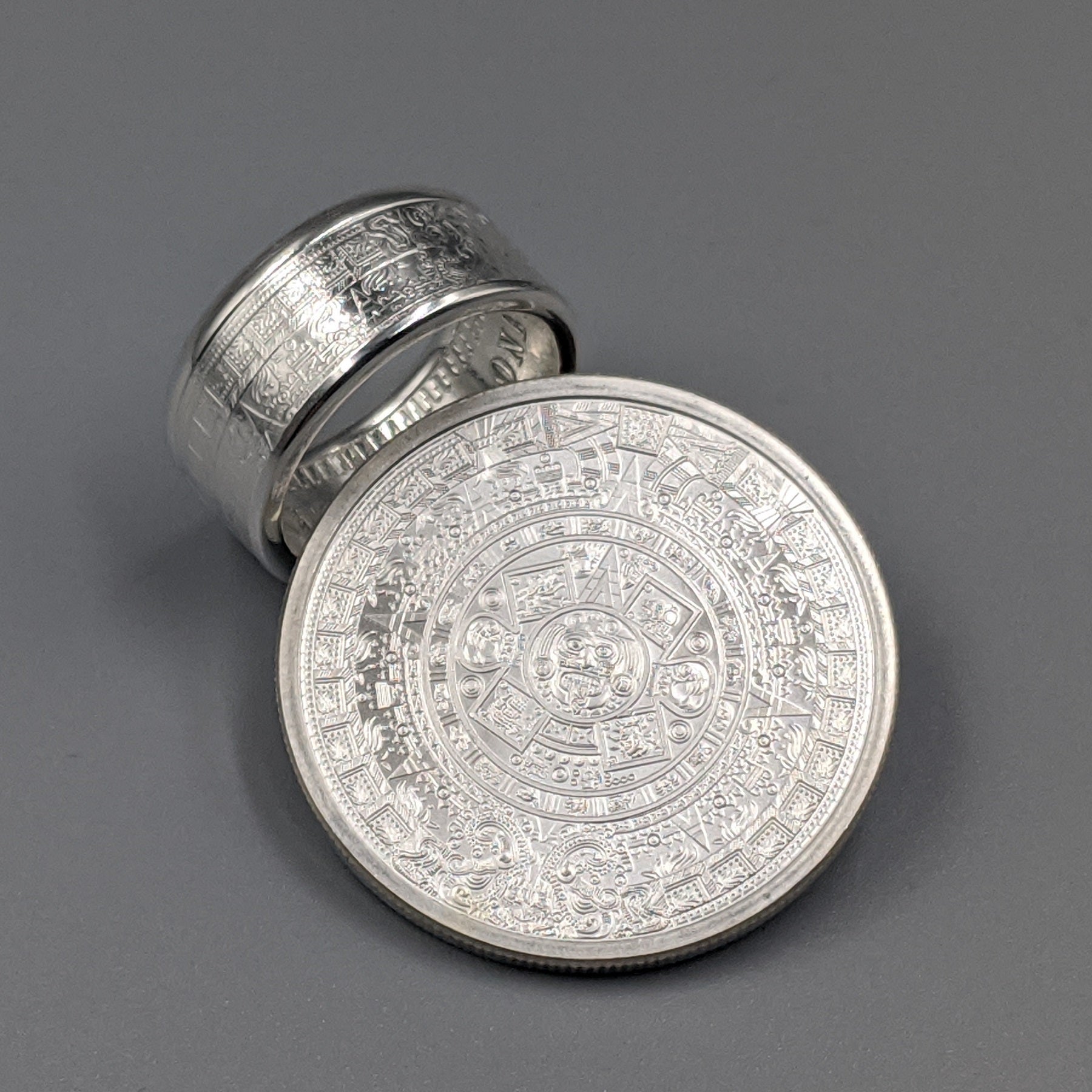 Forged from a genuine 1 oz .999 fine silver Aztec Calendar round, this ring carries the intricate symbols of one of the world’s greatest civilizations. The obverse showcases the legendary Piedra del Sol (Sun Stone) design—a sacred calendar that represents the cosmos and the cycles of life—while the reverse bears complementary imagery celebrating Aztec artistry.