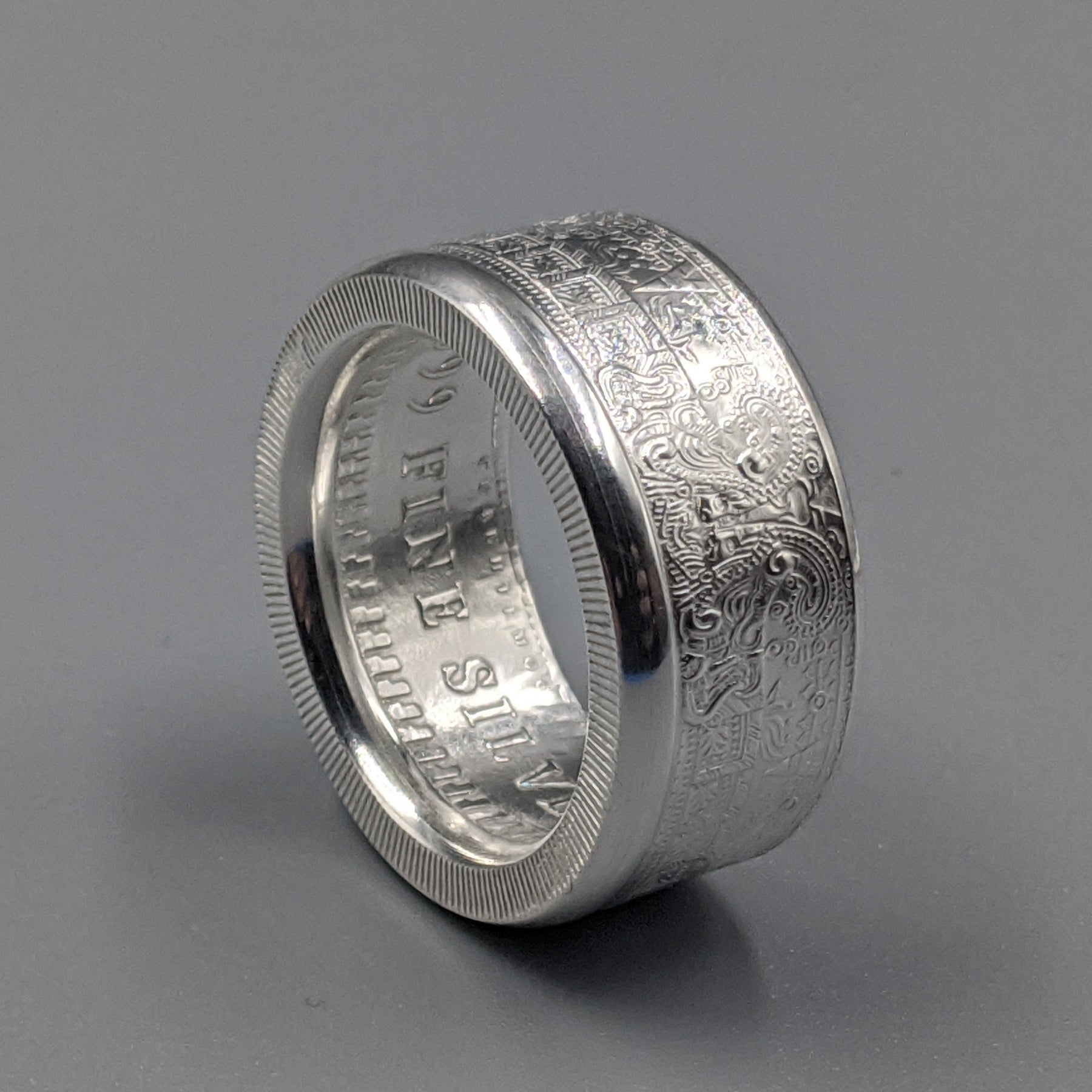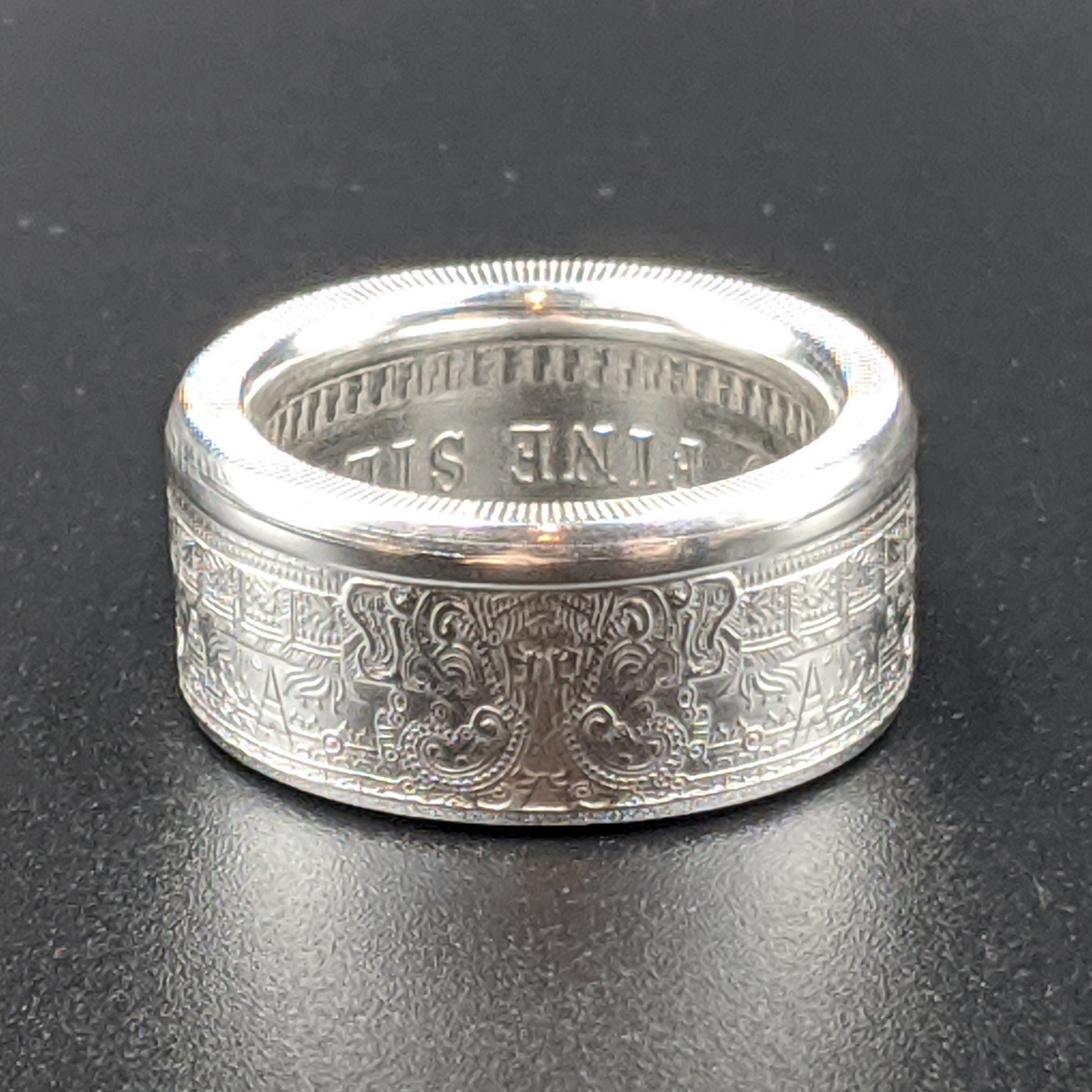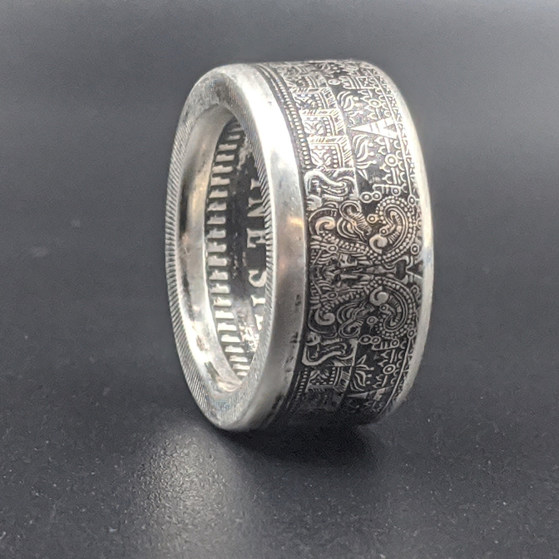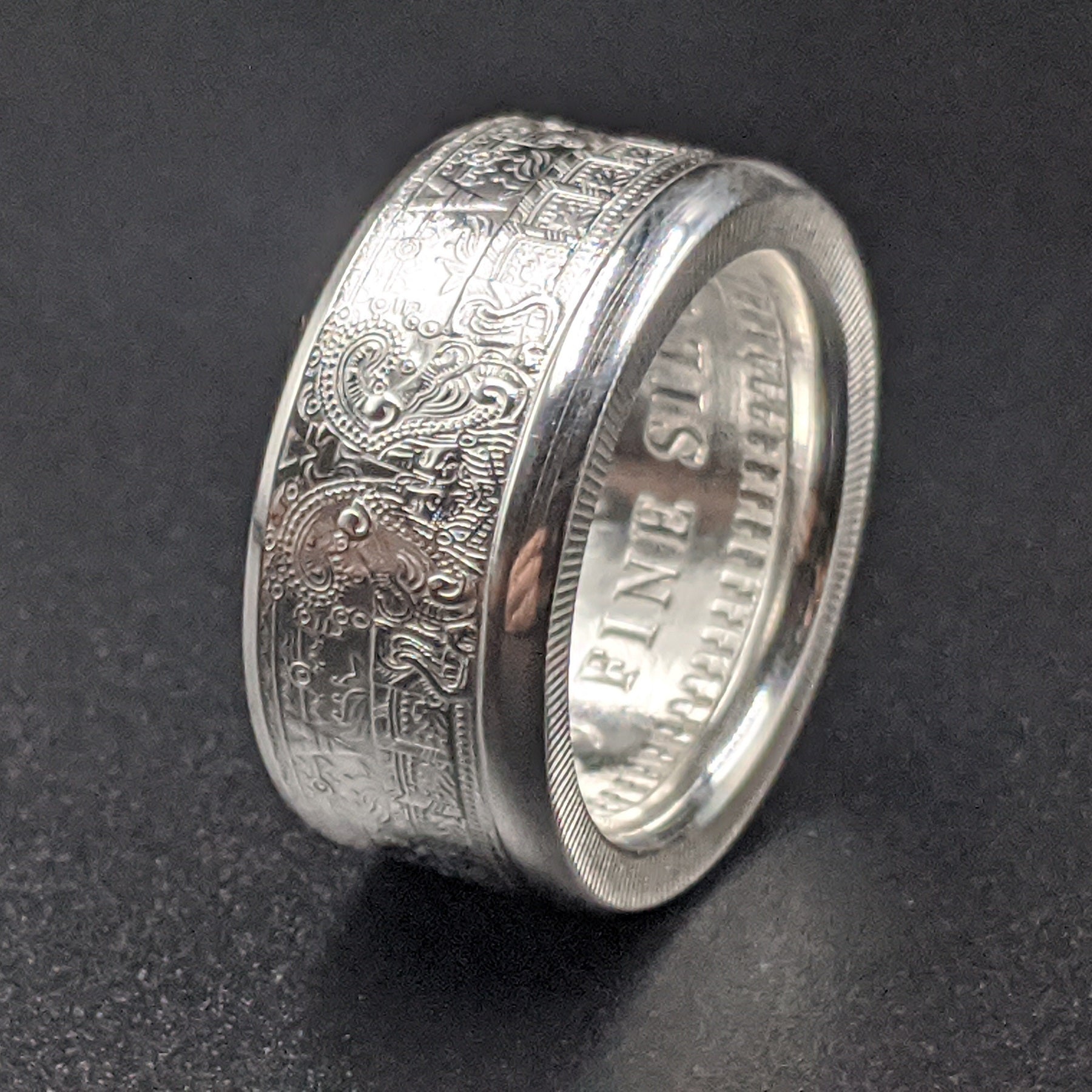 Forged from a genuine 1 oz .999 fine silver Aztec Calendar round, this ring carries the intricate symbols of one of the world’s greatest civilizations. The obverse showcases the legendary Piedra del Sol (Sun Stone) design—a sacred calendar that represents the cosmos and the cycles of life—while the reverse bears complementary imagery celebrating Aztec artistry.