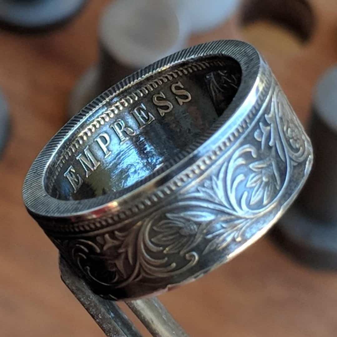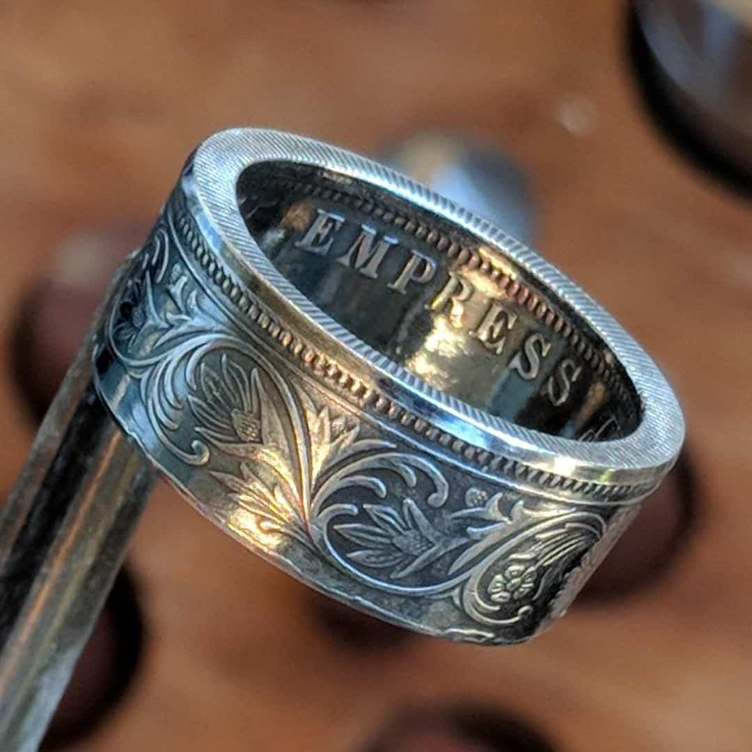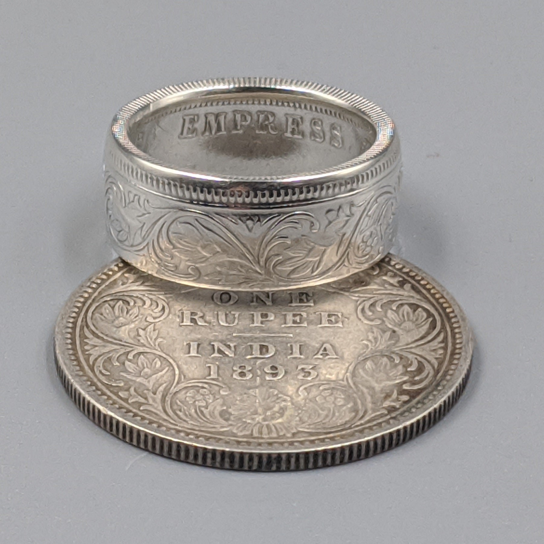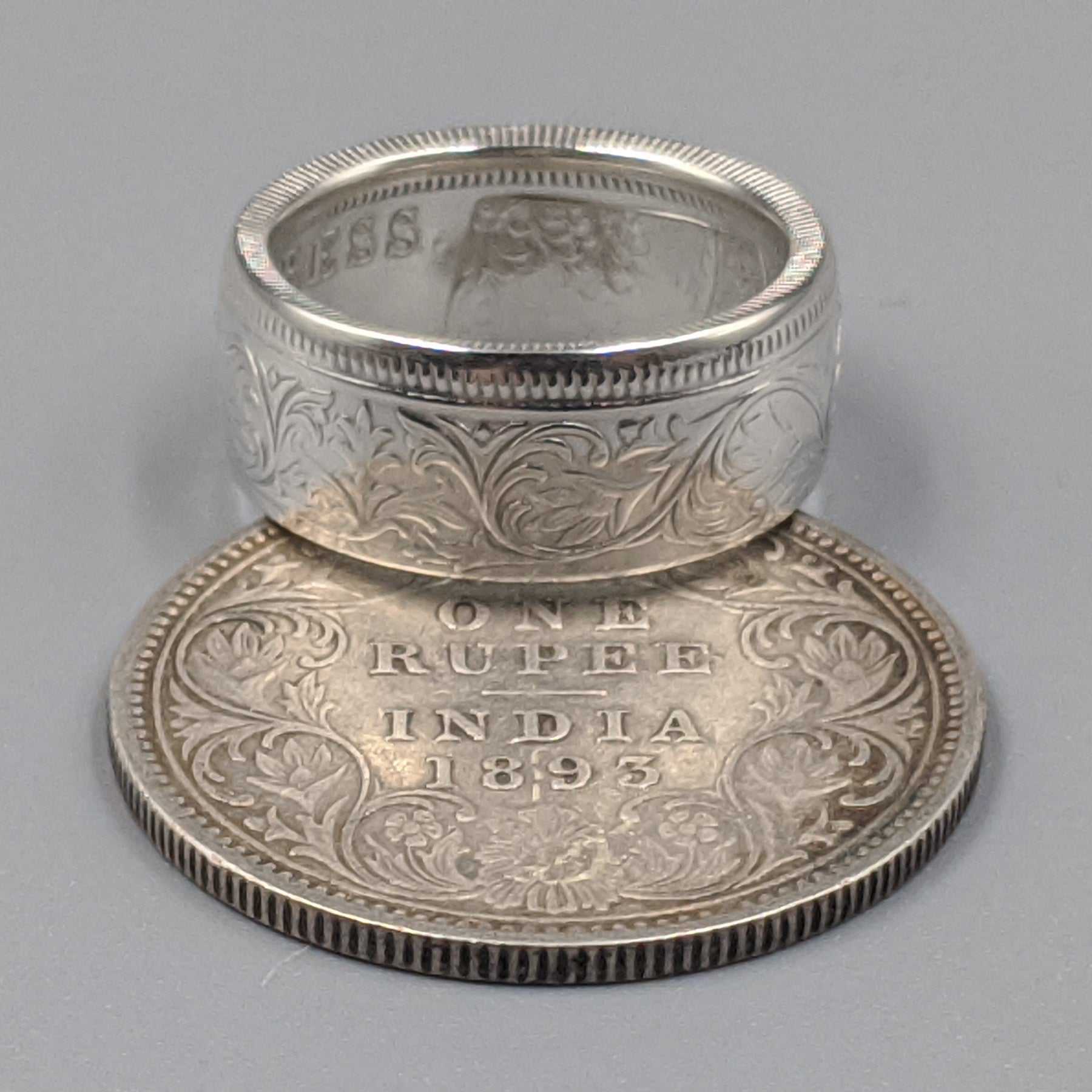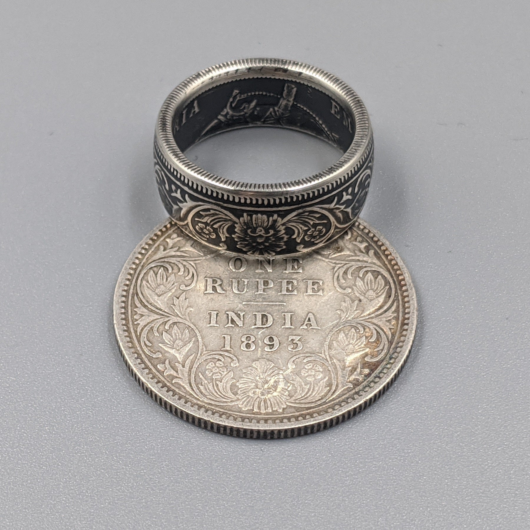 Forged from a genuine British India One Rupee coin, this ring carries the elegance and heritage of the late 19th century. Minted during the reign of Queen Victoria between 1847 and 1901, these coins were struck in .917 fine silver and circulated widely throughout the Indian subcontinent as the backbone of British colonial currency.