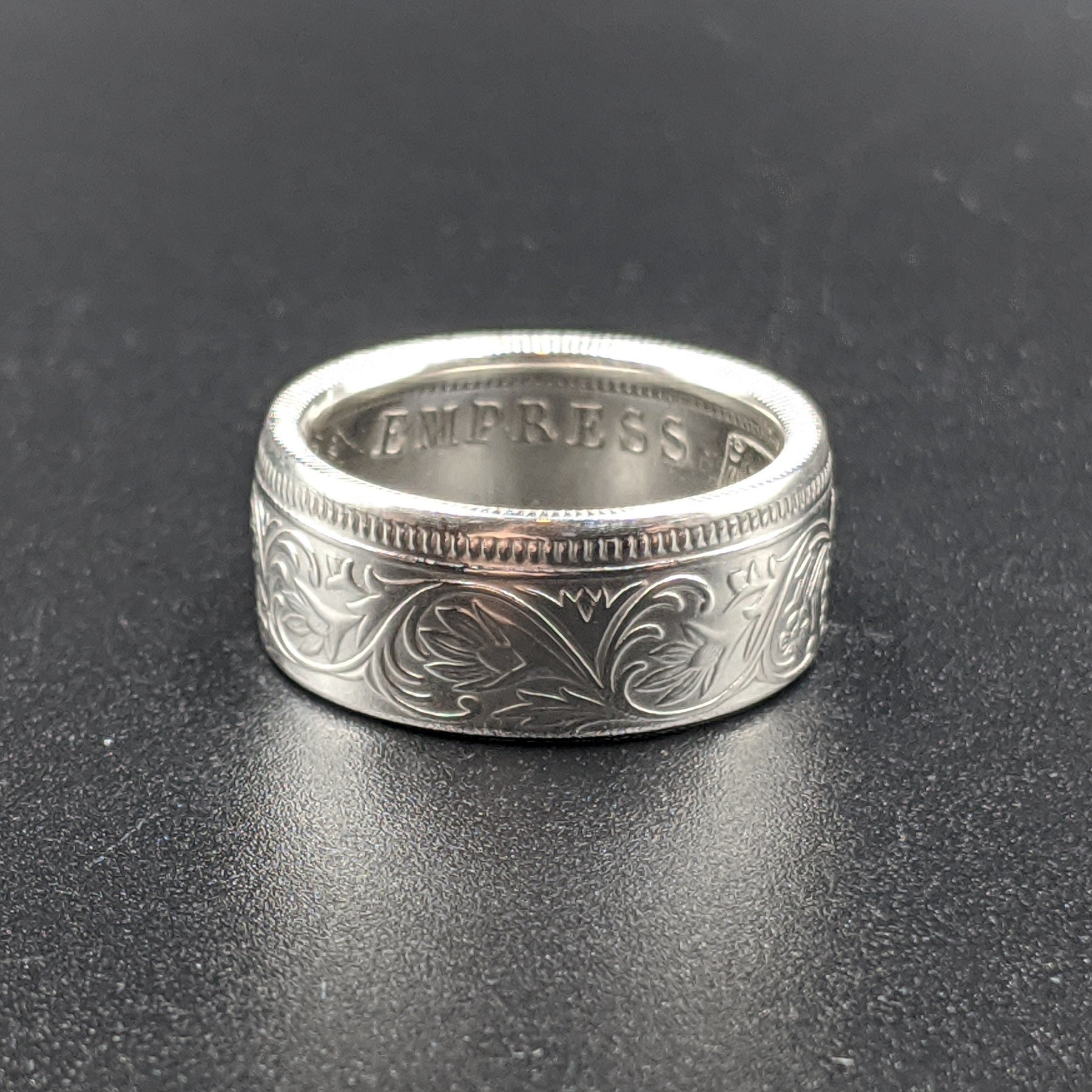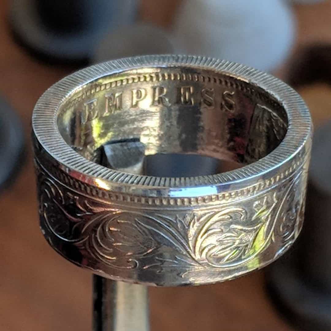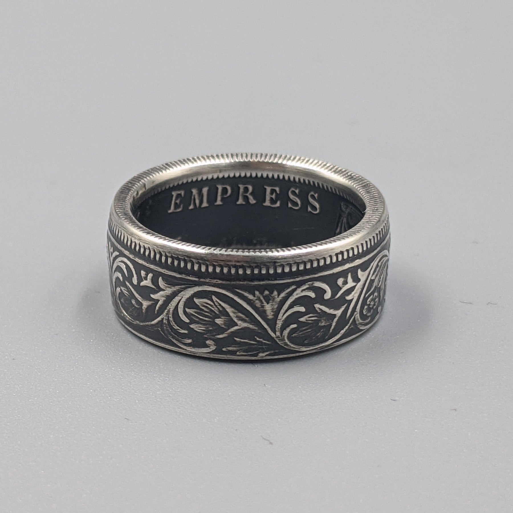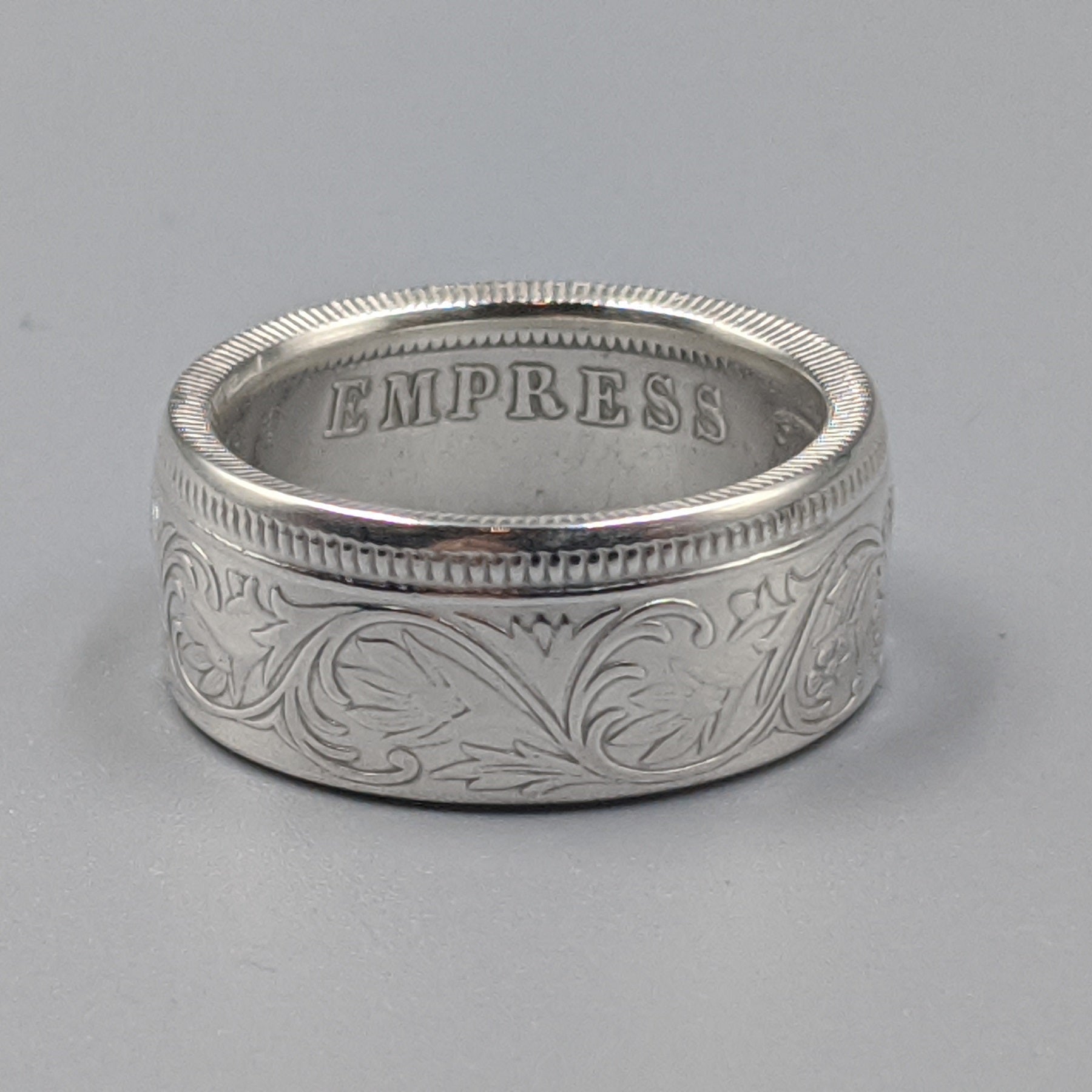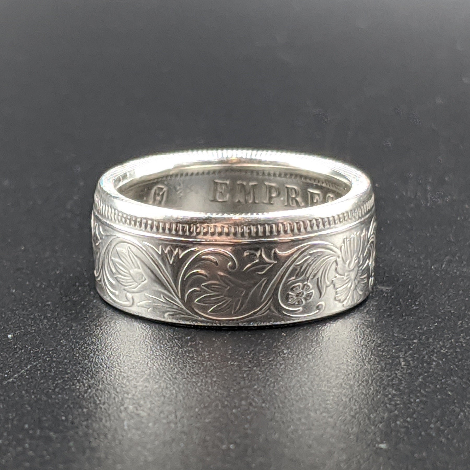 Forged from a genuine British India One Rupee coin, this ring carries the elegance and heritage of the late 19th century. Minted during the reign of Queen Victoria between 1847 and 1901, these coins were struck in .917 fine silver and circulated widely throughout the Indian subcontinent as the backbone of British colonial currency.