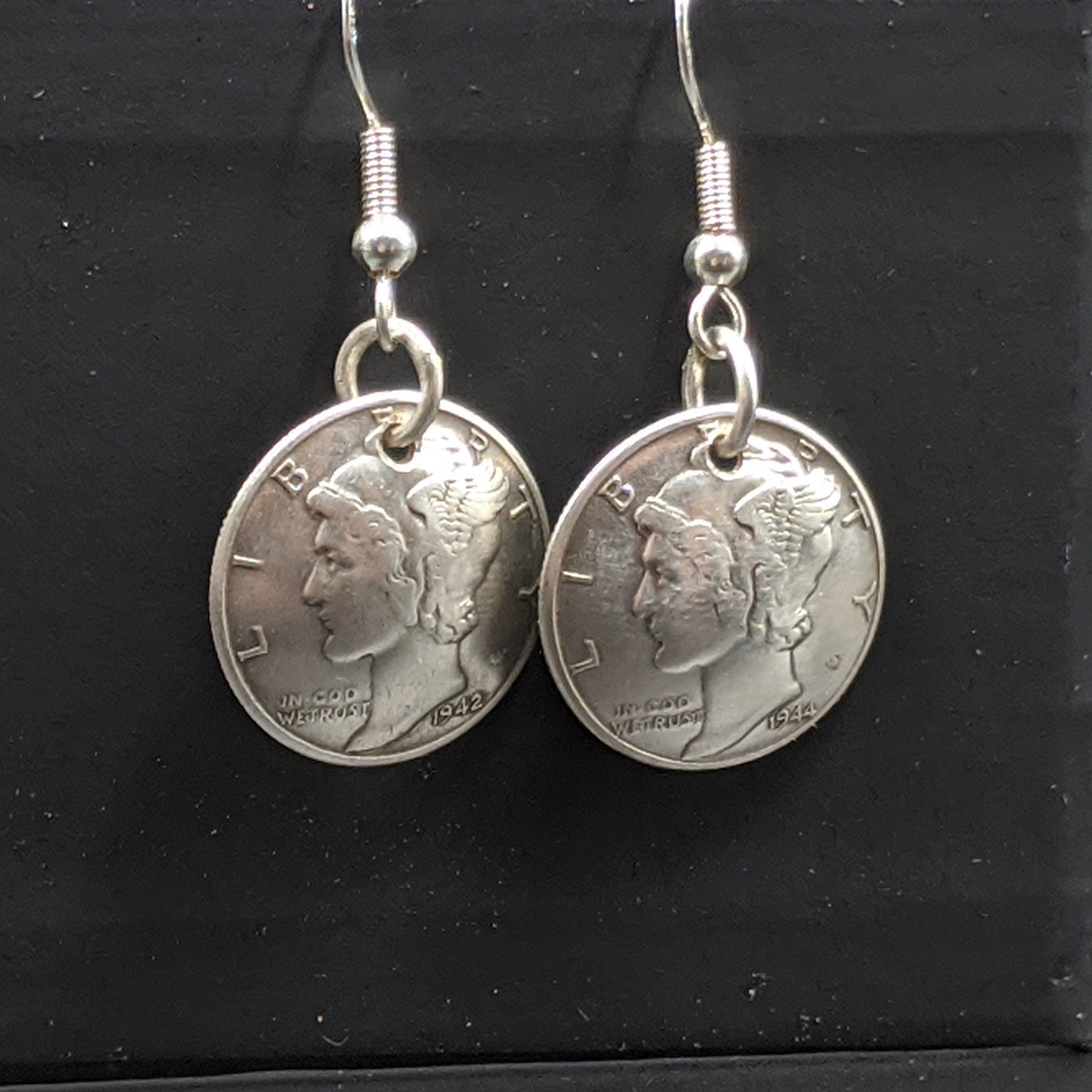The Mercury Dime Drop Earrings pair timeless American history with a graceful, wearable design. Each earring is crafted from a genuine Mercury Dime (.900 fine silver, minted 1916–1945), suspended from a sterling silver French hook that allows it to swing and catch the light with every movement.