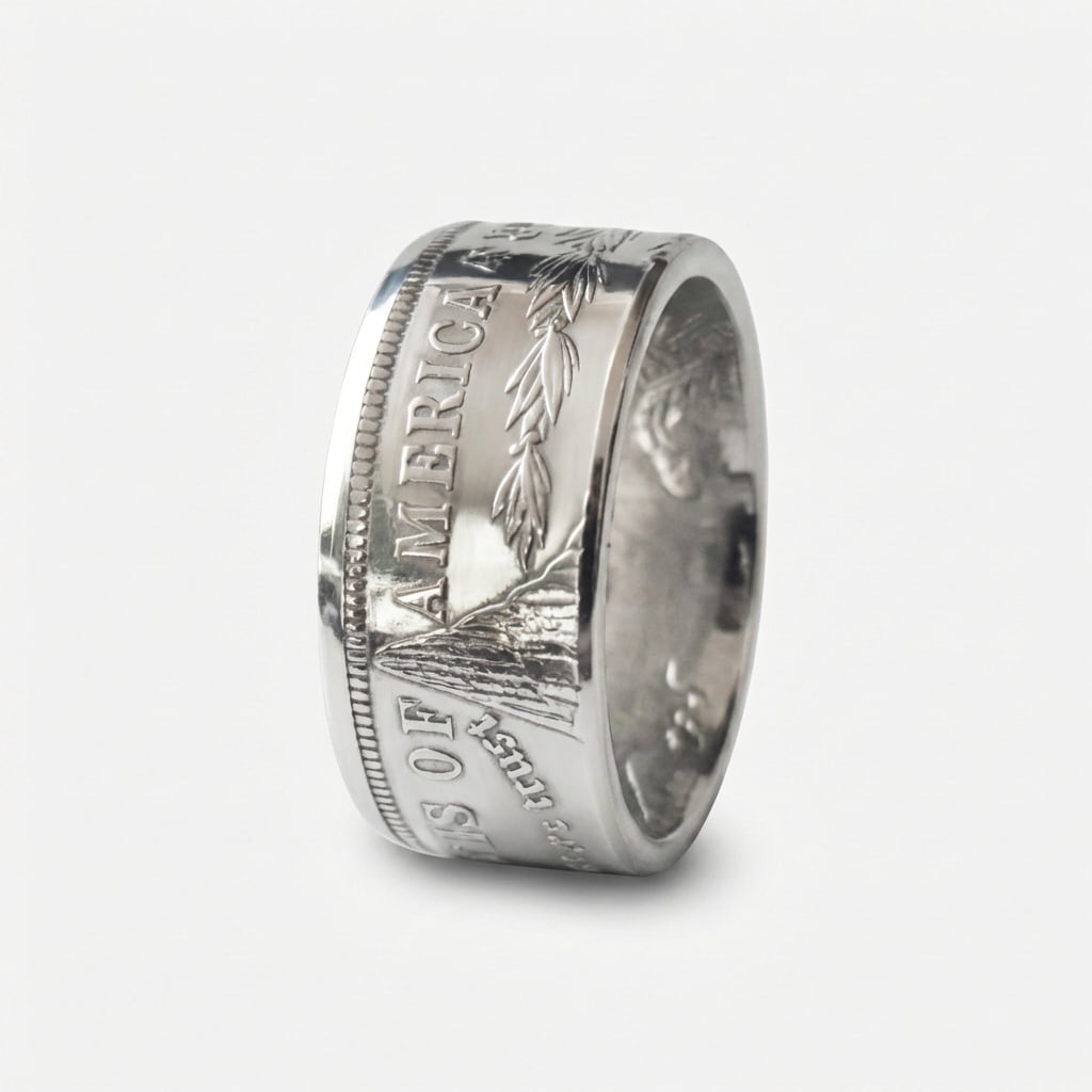 Forged from a 19th-century Morgan Silver Dollar in exceptional condition, this wide-band ring carries real American history in solid silver. Heavy, masculine, and enduring—made to be worn daily and passed forward with purpose.