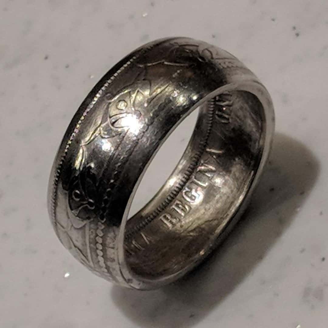 Forged from a genuine Newfoundland 50 Cent coin, this ring captures a unique chapter of North American history. These coins were minted between 1870 and 1947 in .925 sterling silver for the British colony of Newfoundland, then a rugged island nation heavily shaped by its maritime culture. At the time, the 50 Cent coin was the colony’s highest‑value circulating currency, making it a prized possession in its day.