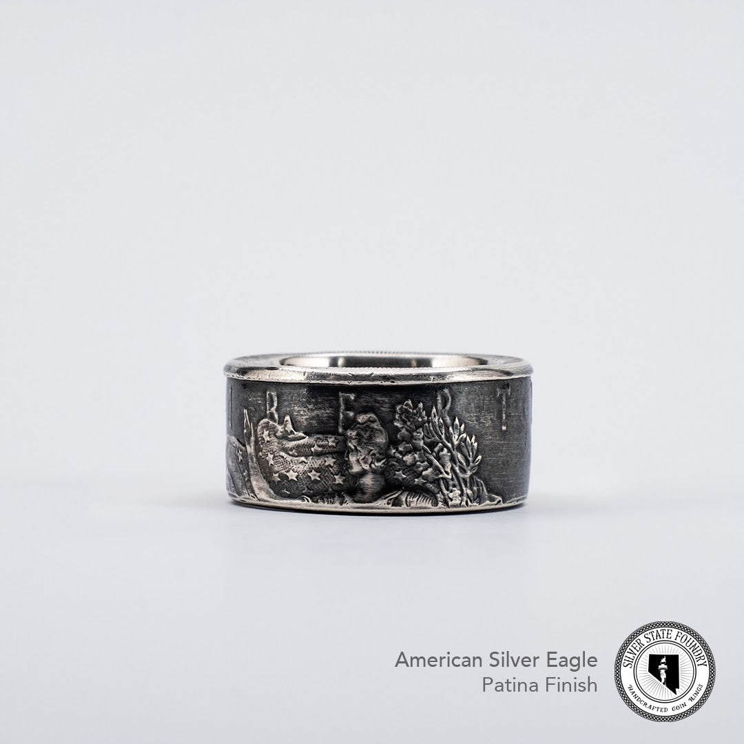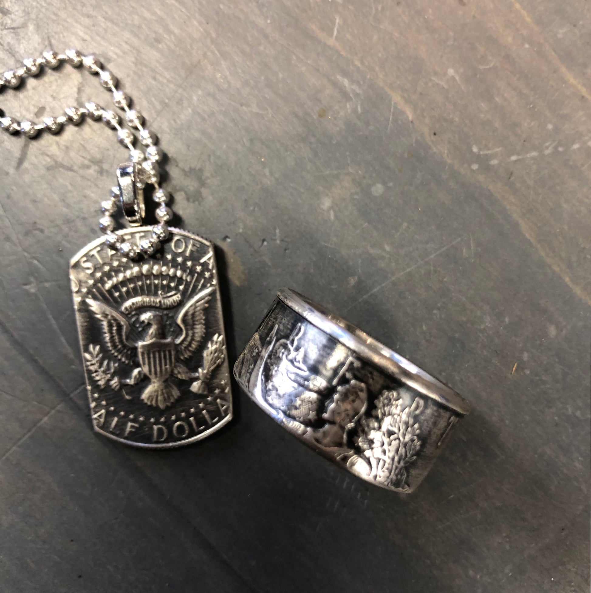 A matched set featuring a hand-forged American Silver Eagle coin ring and a coordinating dog tag. Together, they embody liberty, strength, and American heritage in bold silver.